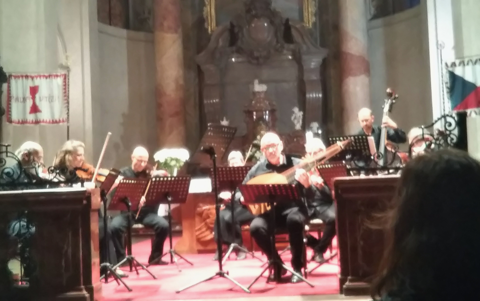 旧市街広場に沿った聖ミクラーシュ教会でのコンサート。ヴィヴァルディ・オーケストラ・プラハによるバロック音楽を中心としたプログラム。中央の大きい楽器はテオルボ Teorbo という多弦のリュートの親分のような楽器で、これが奏でる通奏低音がなかなかいい味を出す。得意とするヴィヴァルディの他、プログラムの最後にはドヴォルジャークのノクターンOp.40 が演奏された。地元チェコで奏でられるドヴォルジャークは、静かで内省的なこっくりとした味わいのある音楽。プラハの夜のとばりが降りる頃にしっくりくる深い情感に、しばし時空を超える想いだった。